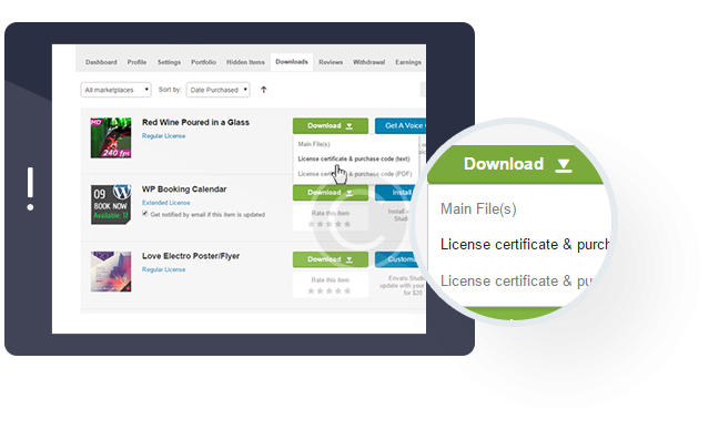 - Click „download” button, and in the drop-down menu select „license certificate & purchase code”.